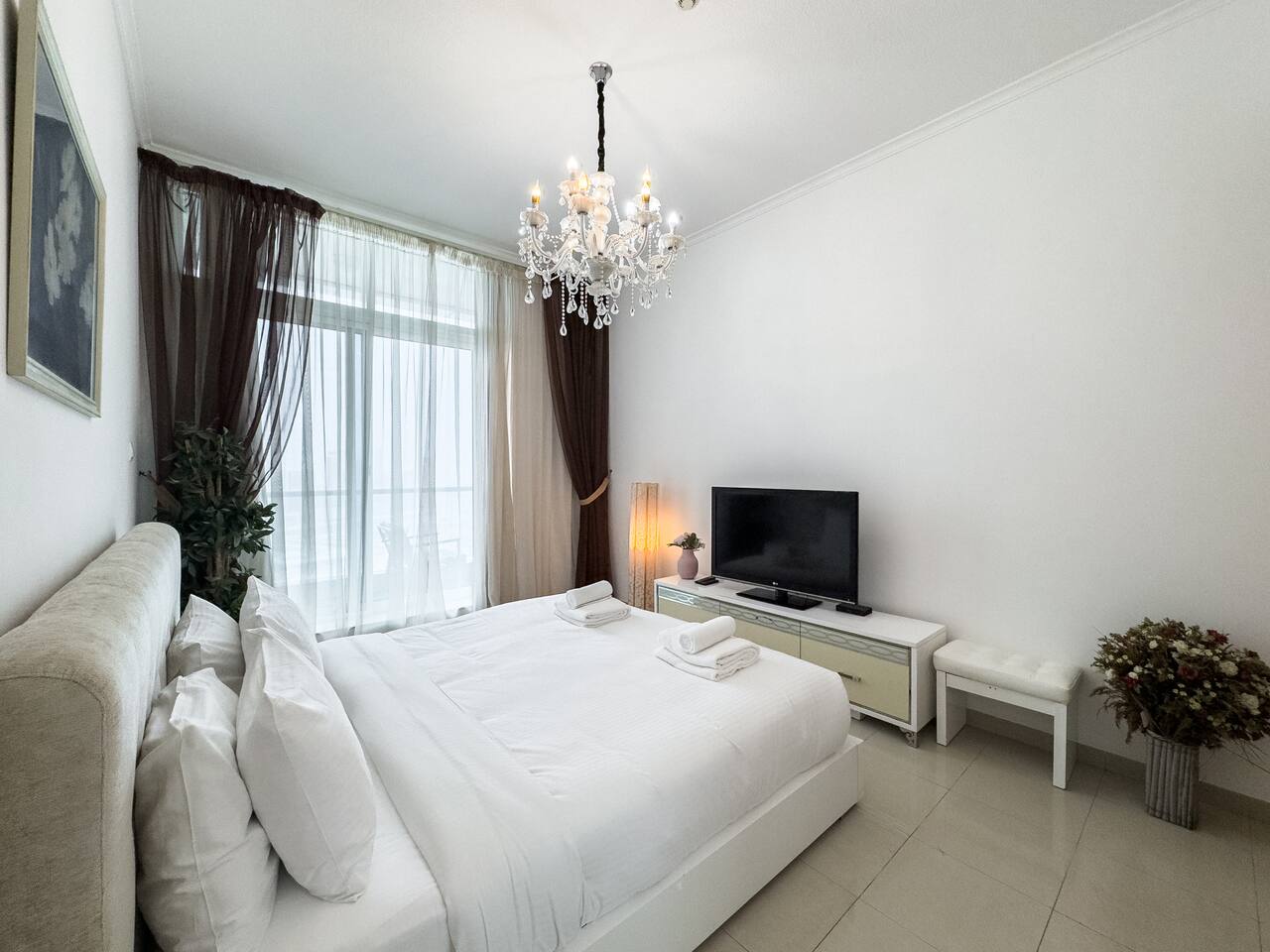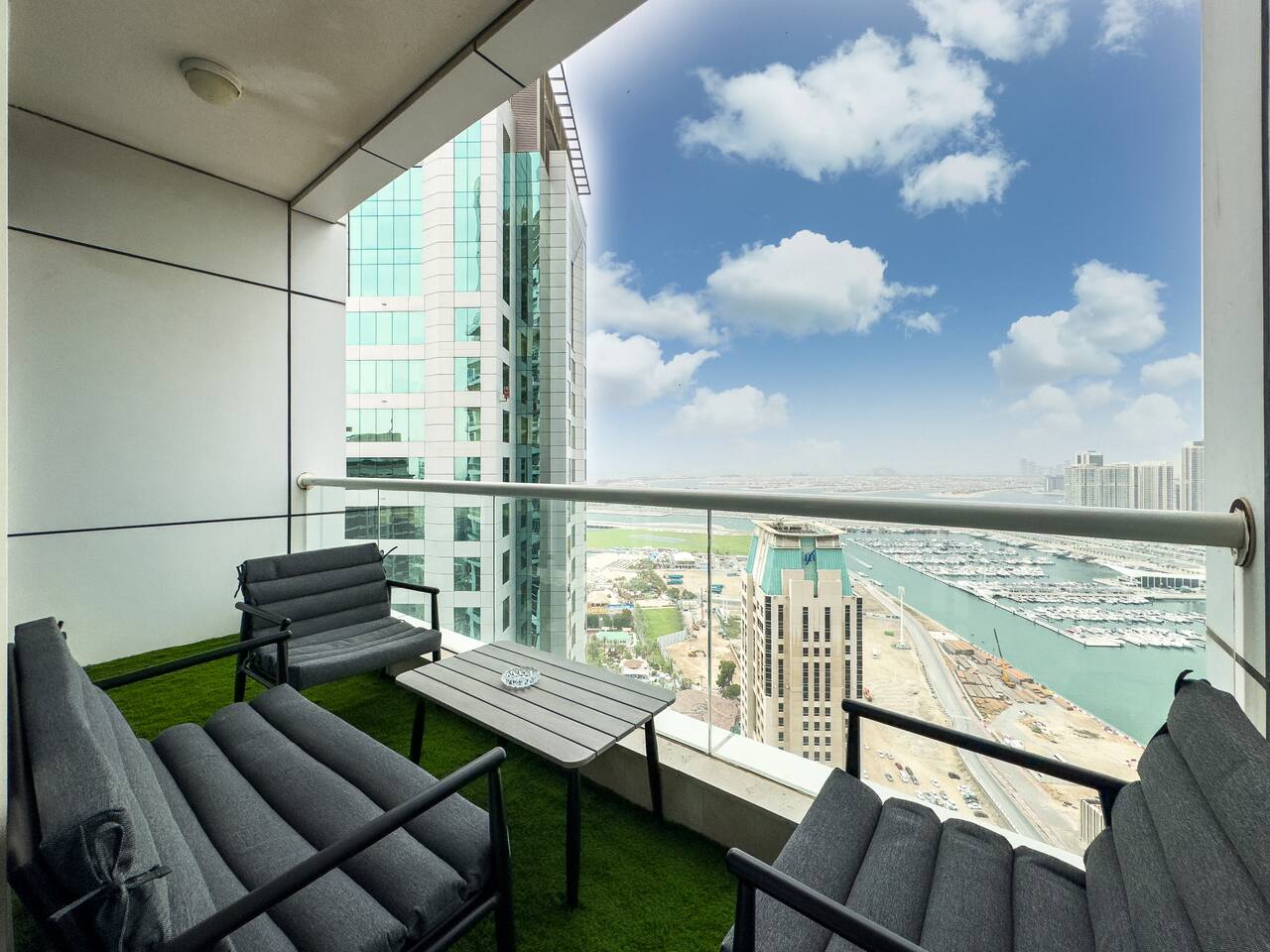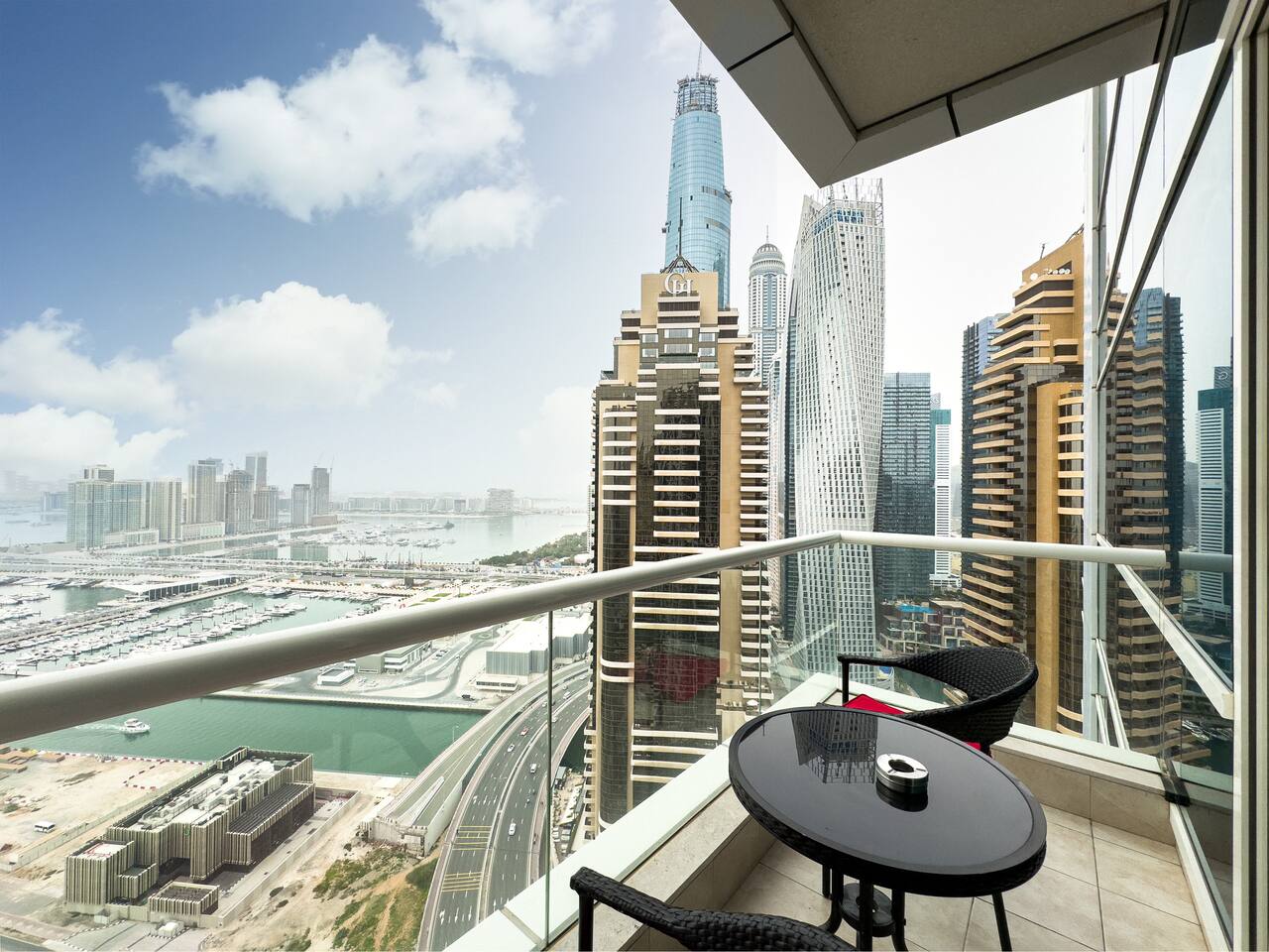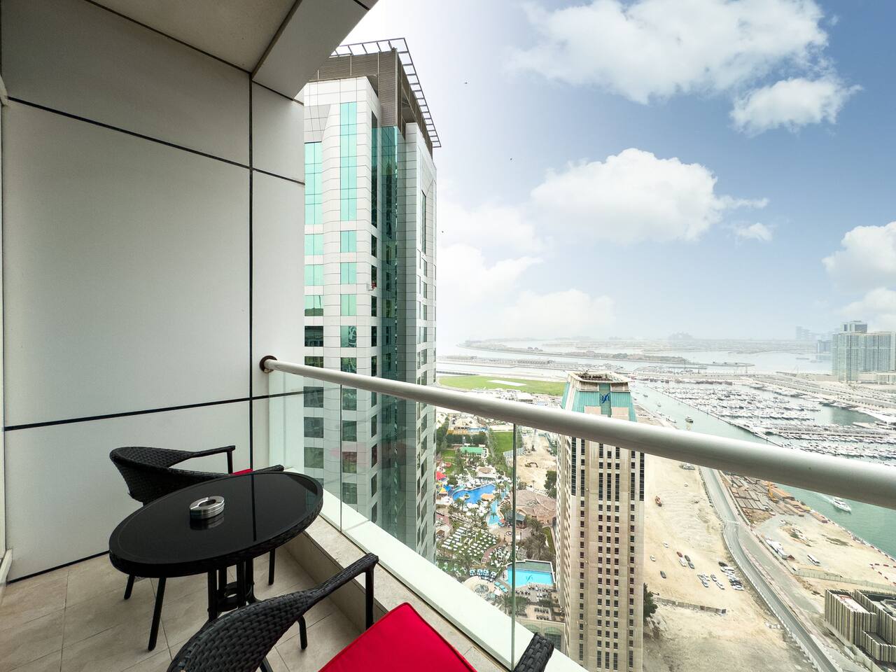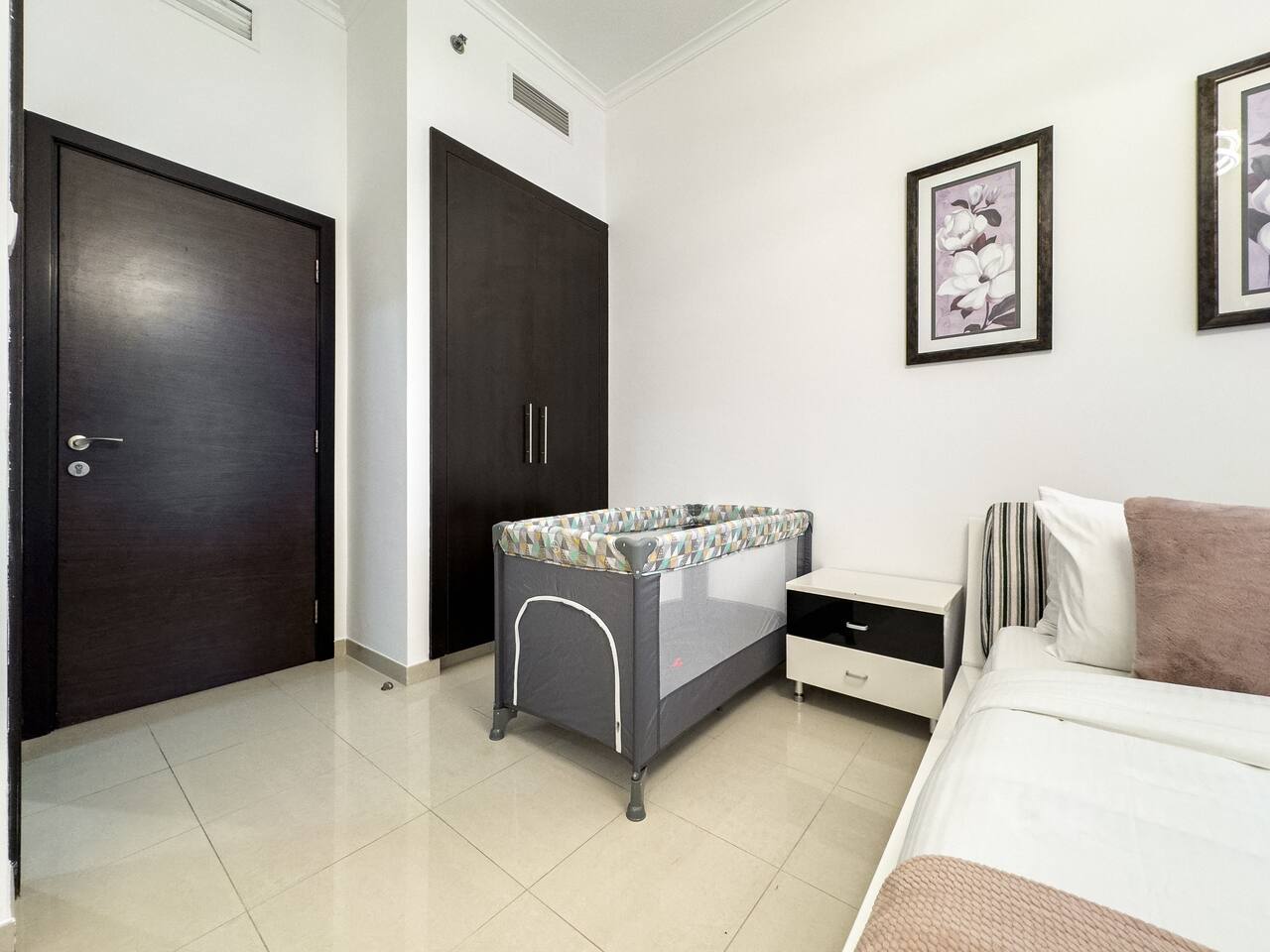 This view? Yours. From two balconies. This high-floor 2BR gives you Marina and Palm views the moment you walk in, no filters needed. There’s a 24/7 supermarket downstairs for snacks, water, or whatever you forgot to pack. JBR Beach is a 15-min walk, The Walk is 7 mins, and Marina Mall is 19. Bus stop? 3 mins away. Metro? Close by. Got kids? You’ll have a crib, high chair, potty, and more—all included. It’s easy, it’s comfortable, and the view does the heavy lifting.