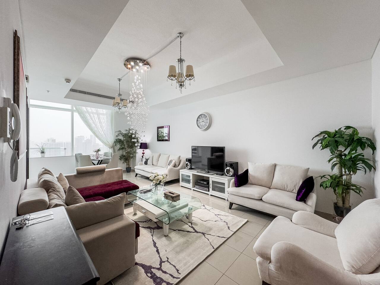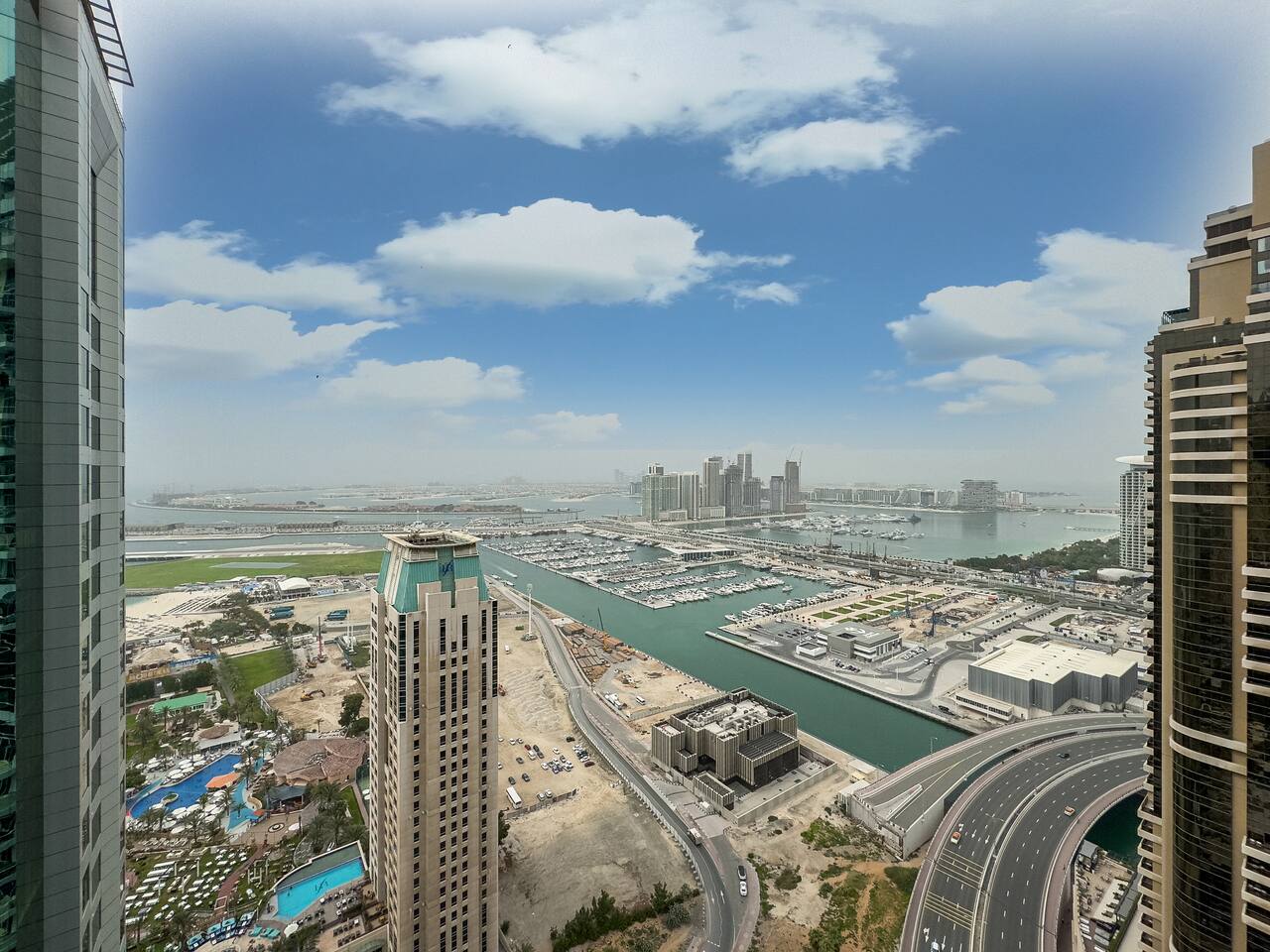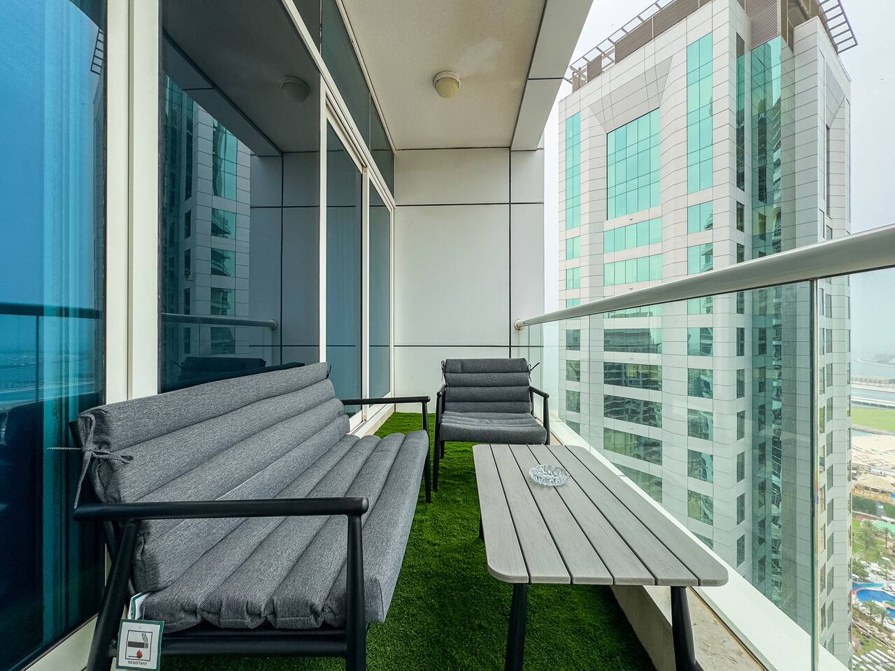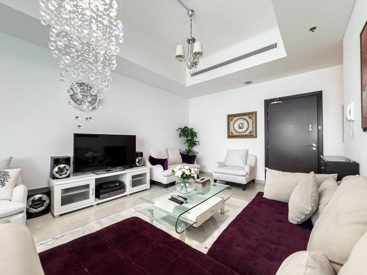 This view? Yours. From two balconies. This high-floor 2BR gives you Marina and Palm views the moment you walk in, no filters needed. There’s a 24/7 supermarket downstairs for snacks, water, or whatever you forgot to pack. JBR Beach is a 15-min walk, The Walk is 7 mins, and Marina Mall is 19. Bus stop? 3 mins away. Metro? Close by. Got kids? You’ll have a crib, high chair, potty, and more—all included. It’s easy, it’s comfortable, and the view does the heavy lifting.