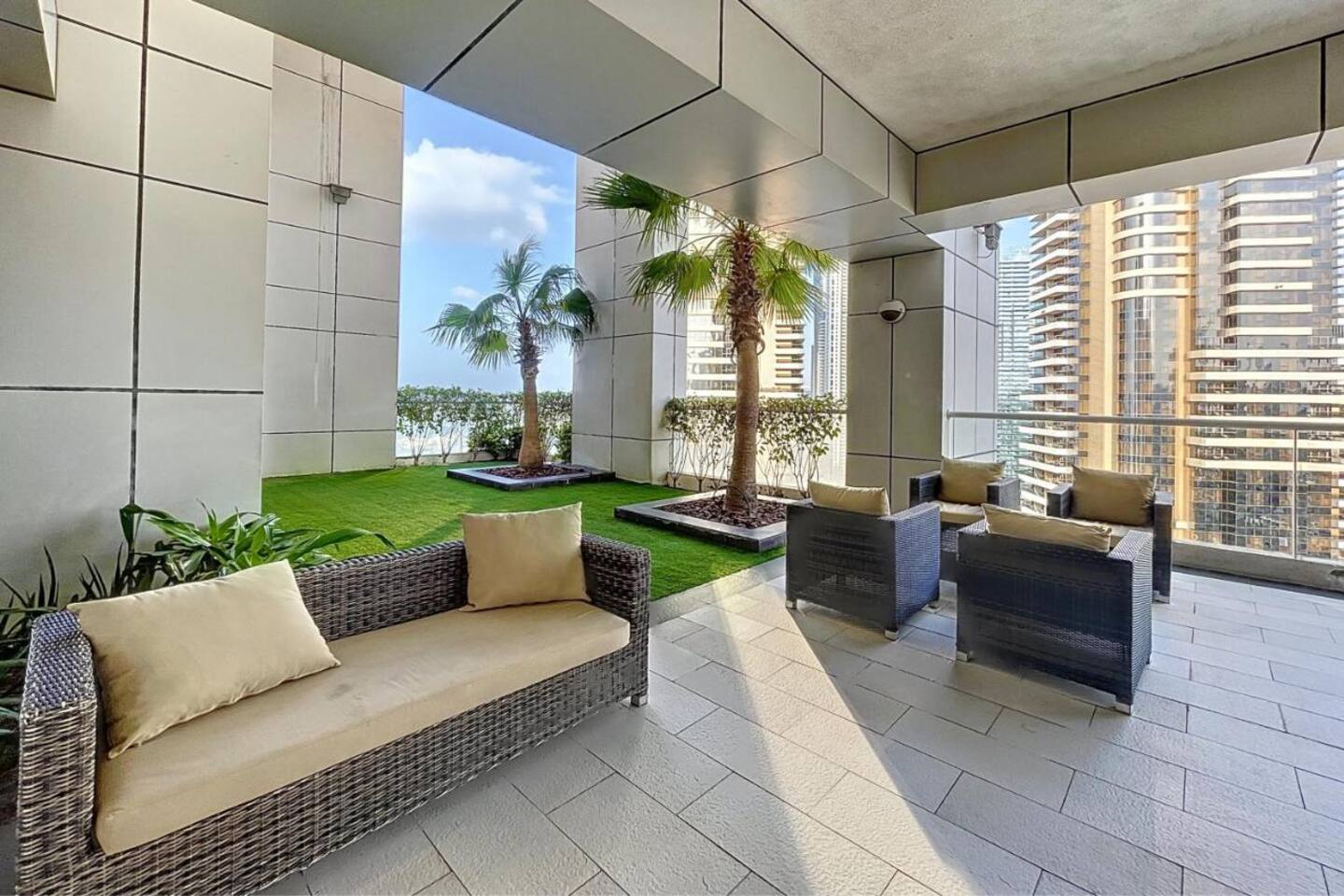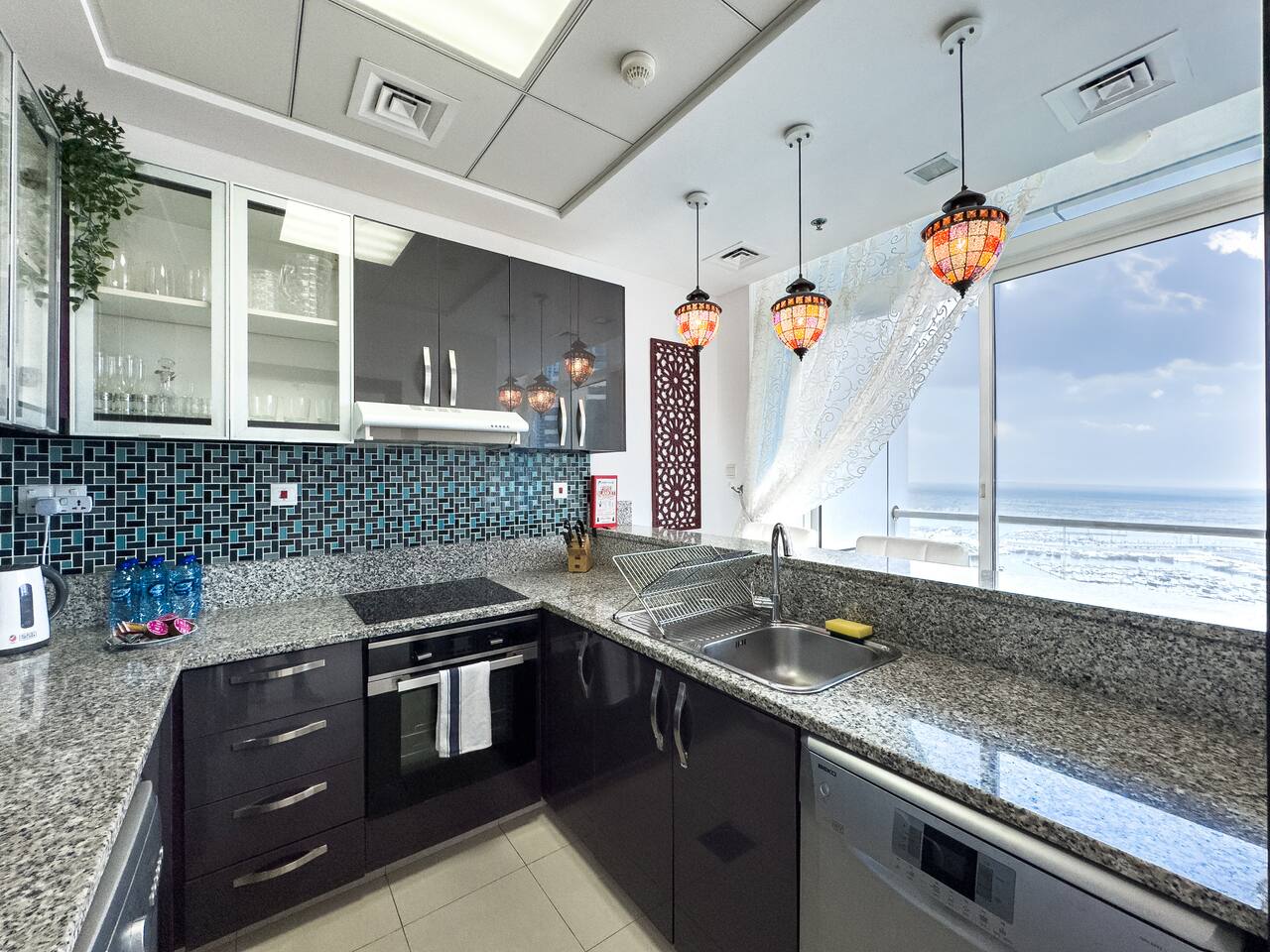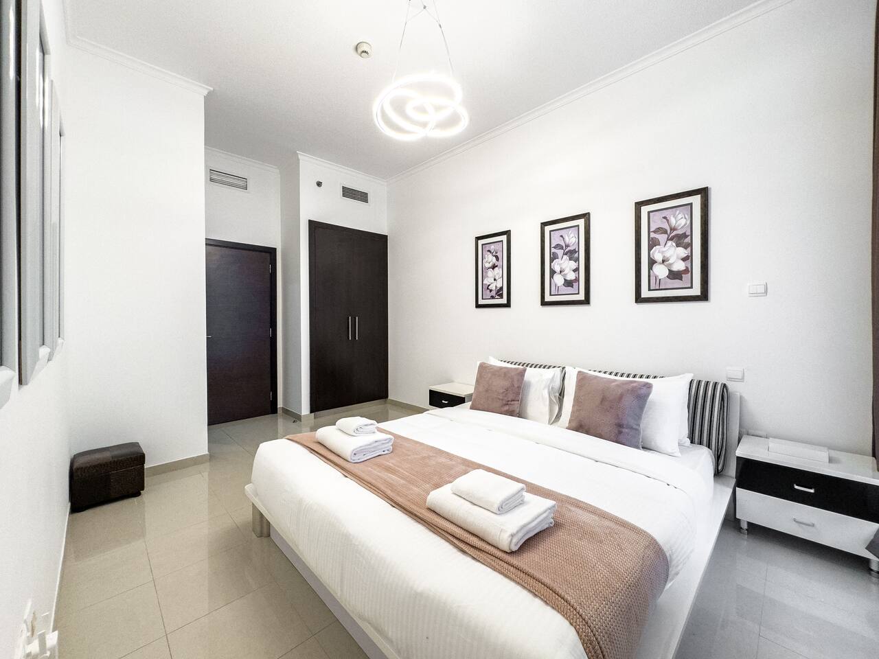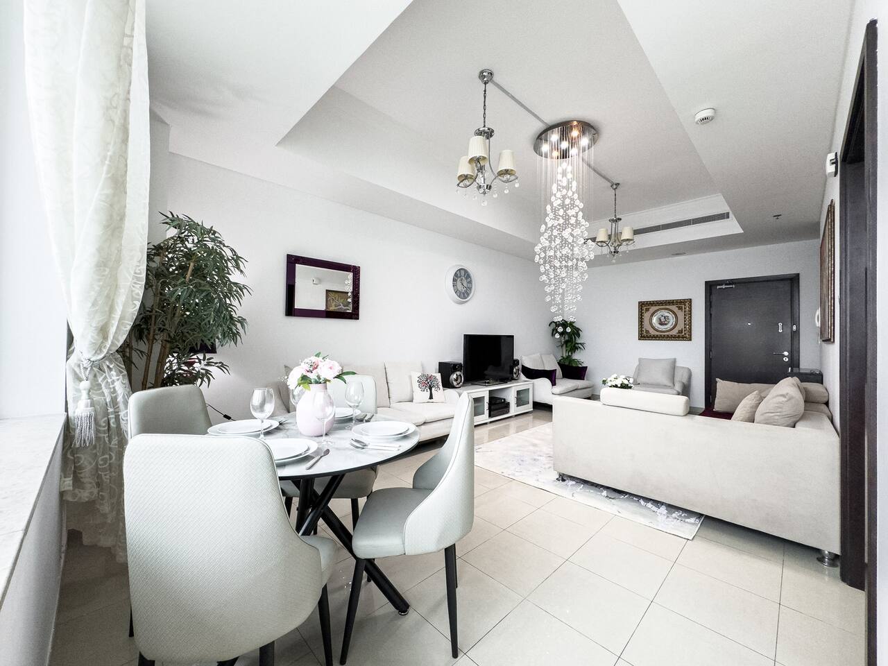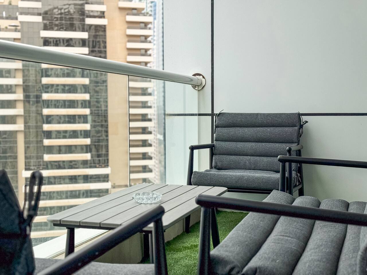 This view? Yours. From two balconies. This high-floor 2BR gives you Marina and Palm views the moment you walk in, no filters needed. There’s a 24/7 supermarket downstairs for snacks, water, or whatever you forgot to pack. JBR Beach is a 15-min walk, The Walk is 7 mins, and Marina Mall is 19. Bus stop? 3 mins away. Metro? Close by. Got kids? You’ll have a crib, high chair, potty, and more—all included. It’s easy, it’s comfortable, and the view does the heavy lifting.