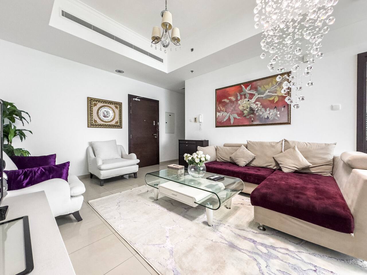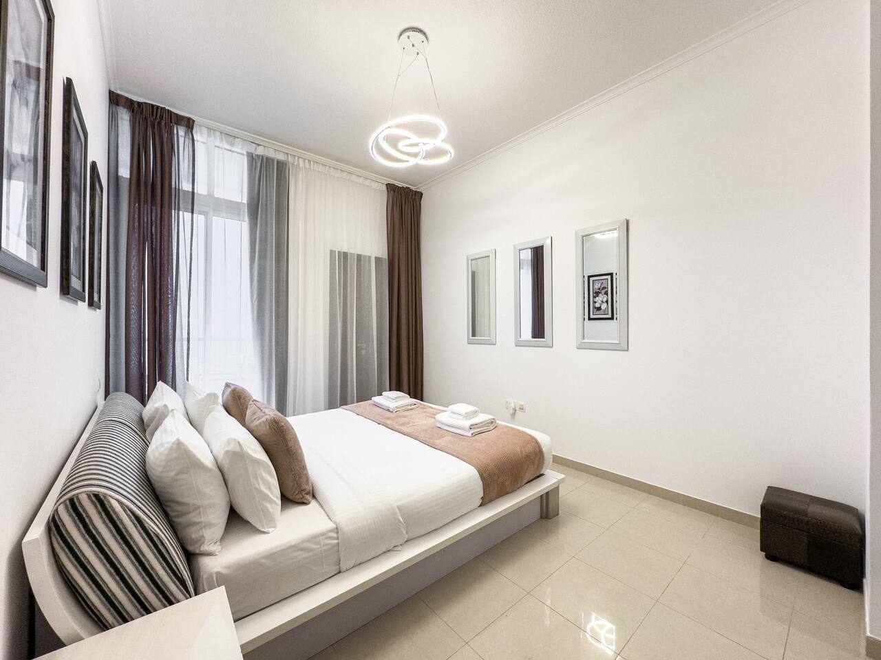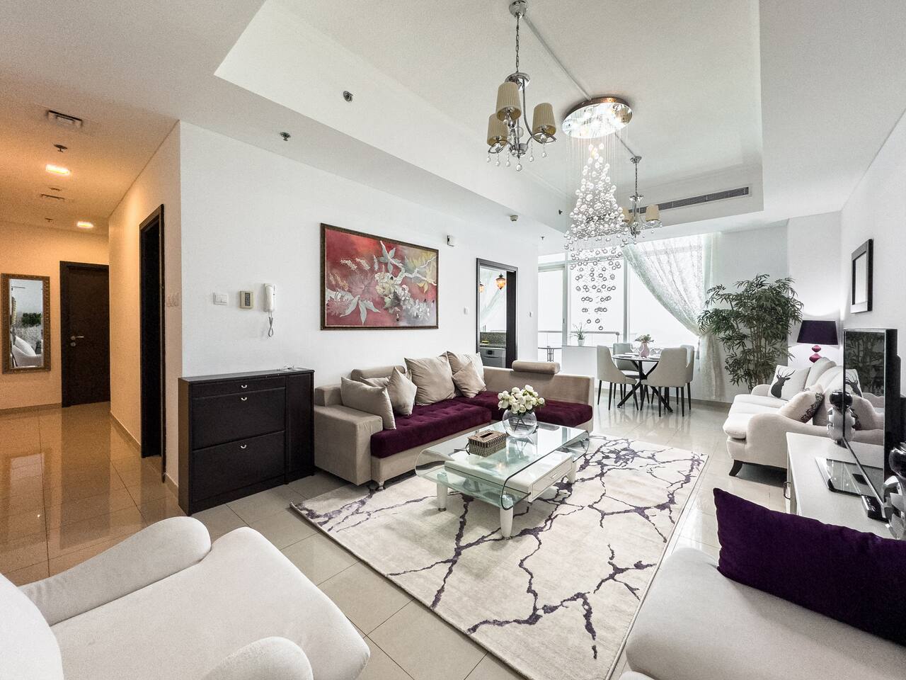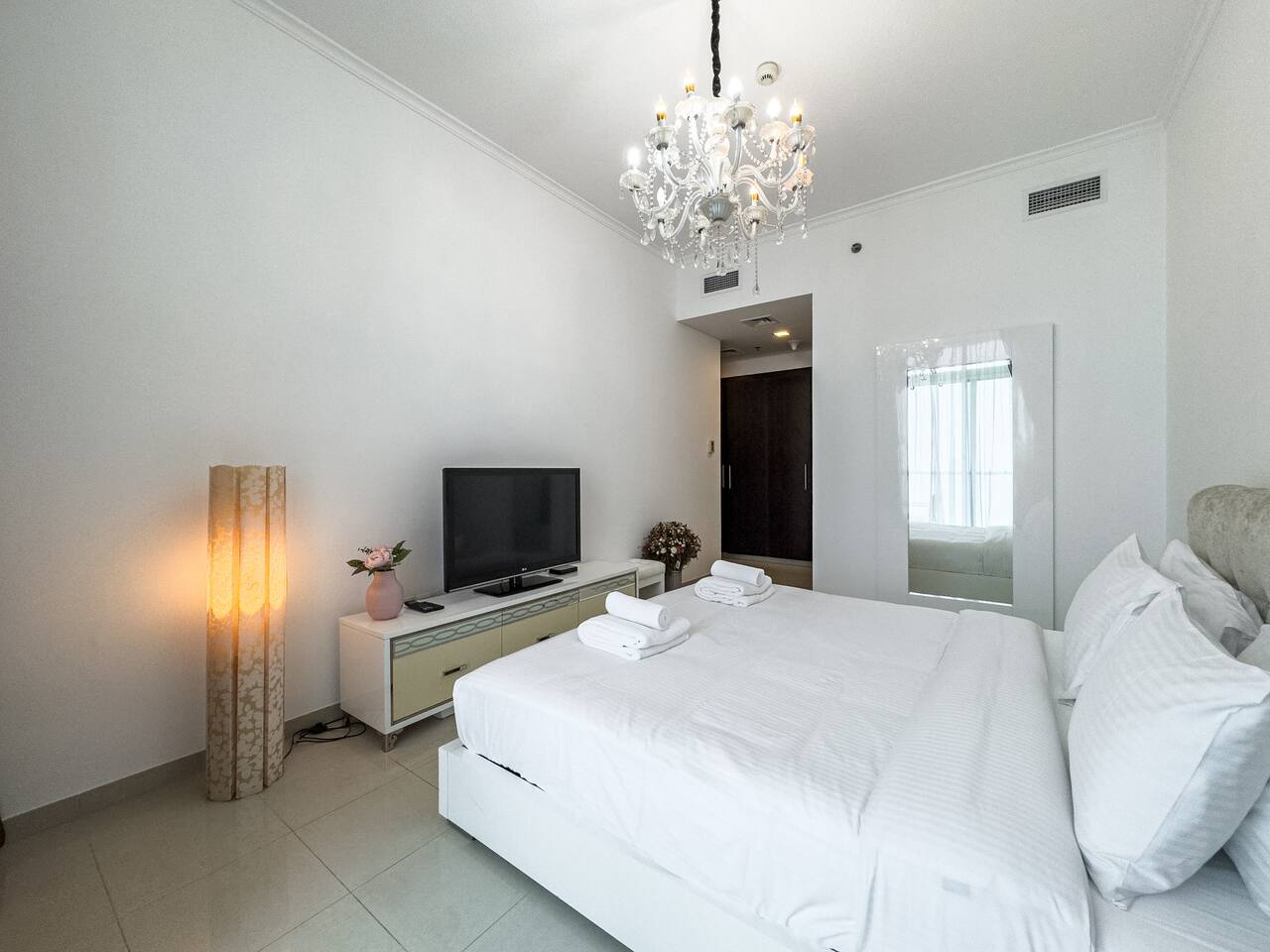 This view? Yours. From two balconies. This high-floor 2BR gives you Marina and Palm views the moment you walk in, no filters needed. There’s a 24/7 supermarket downstairs for snacks, water, or whatever you forgot to pack. JBR Beach is a 15-min walk, The Walk is 7 mins, and Marina Mall is 19. Bus stop? 3 mins away. Metro? Close by. Got kids? You’ll have a crib, high chair, potty, and more—all included. It’s easy, it’s comfortable, and the view does the heavy lifting.