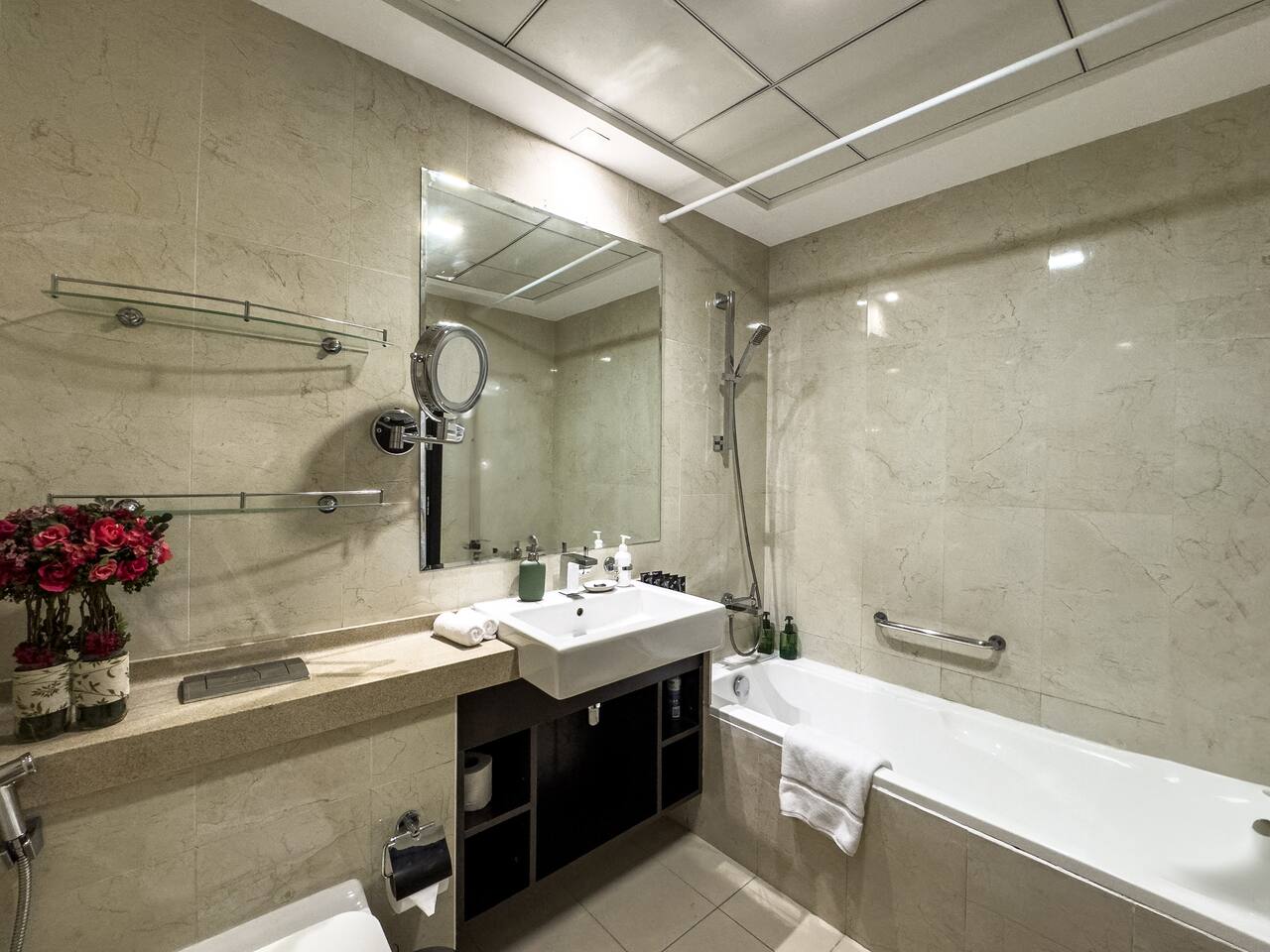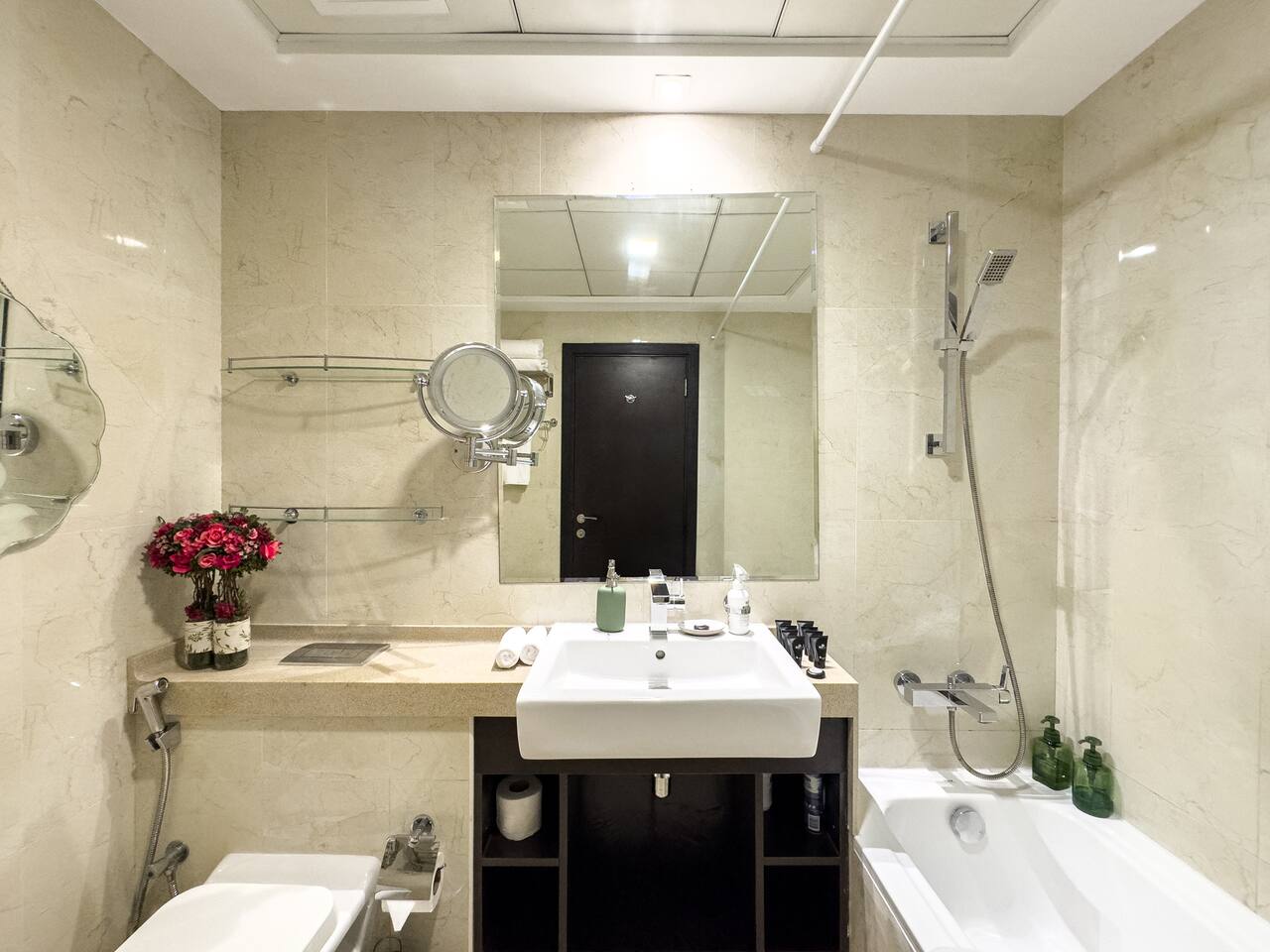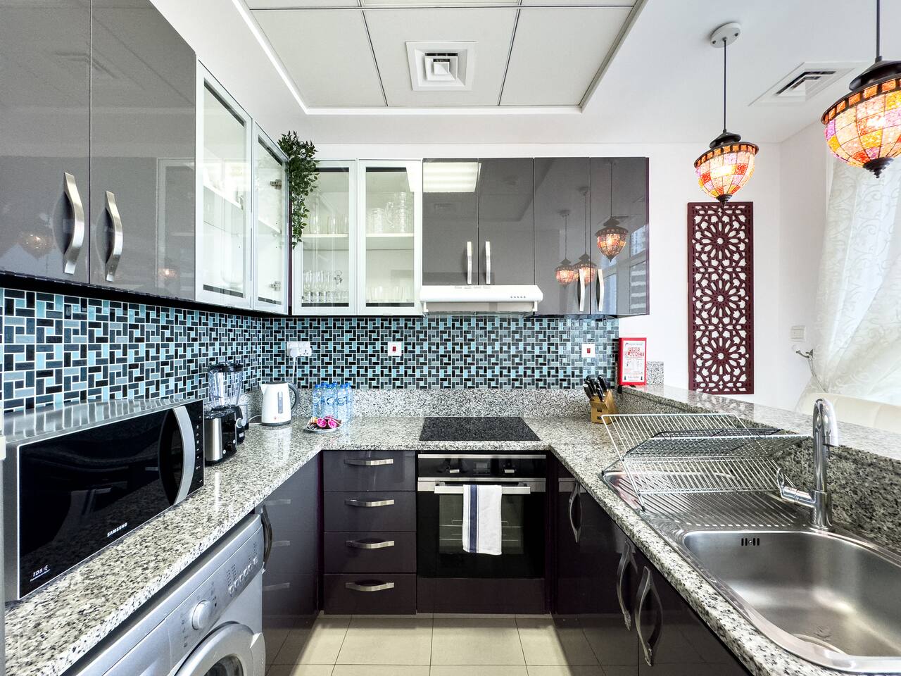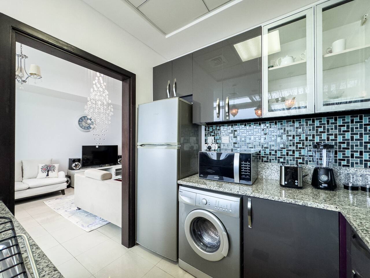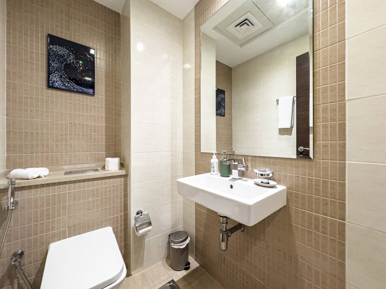This view? Yours. From two balconies. This high-floor 2BR gives you Marina and Palm views the moment you walk in, no filters needed. There’s a 24/7 supermarket downstairs for snacks, water, or whatever you forgot to pack. JBR Beach is a 15-min walk, The Walk is 7 mins, and Marina Mall is 19. Bus stop? 3 mins away. Metro? Close by. Got kids? You’ll have a crib, high chair, potty, and more—all included. It’s easy, it’s comfortable, and the view does the heavy lifting.