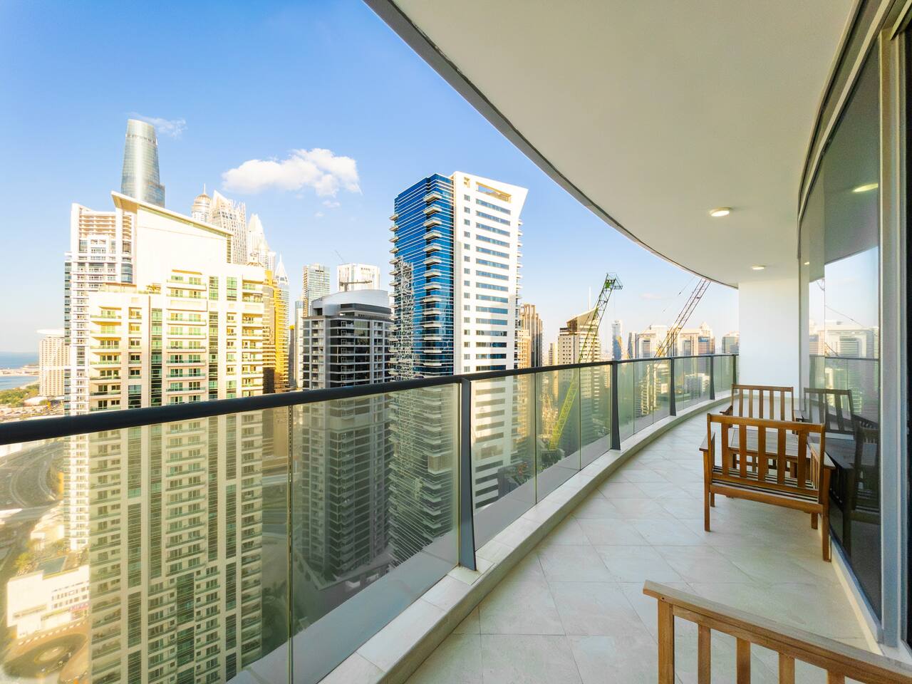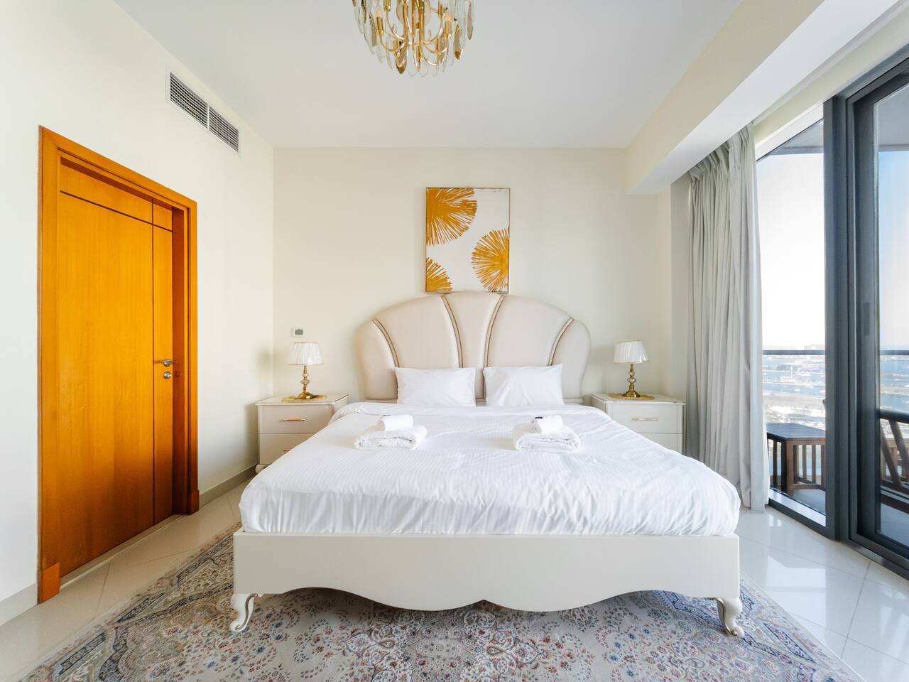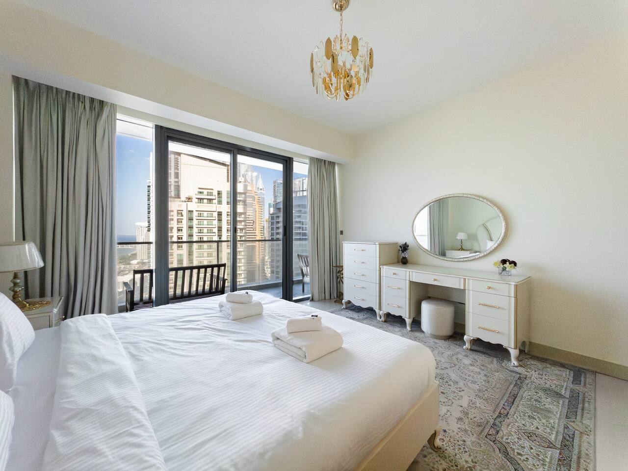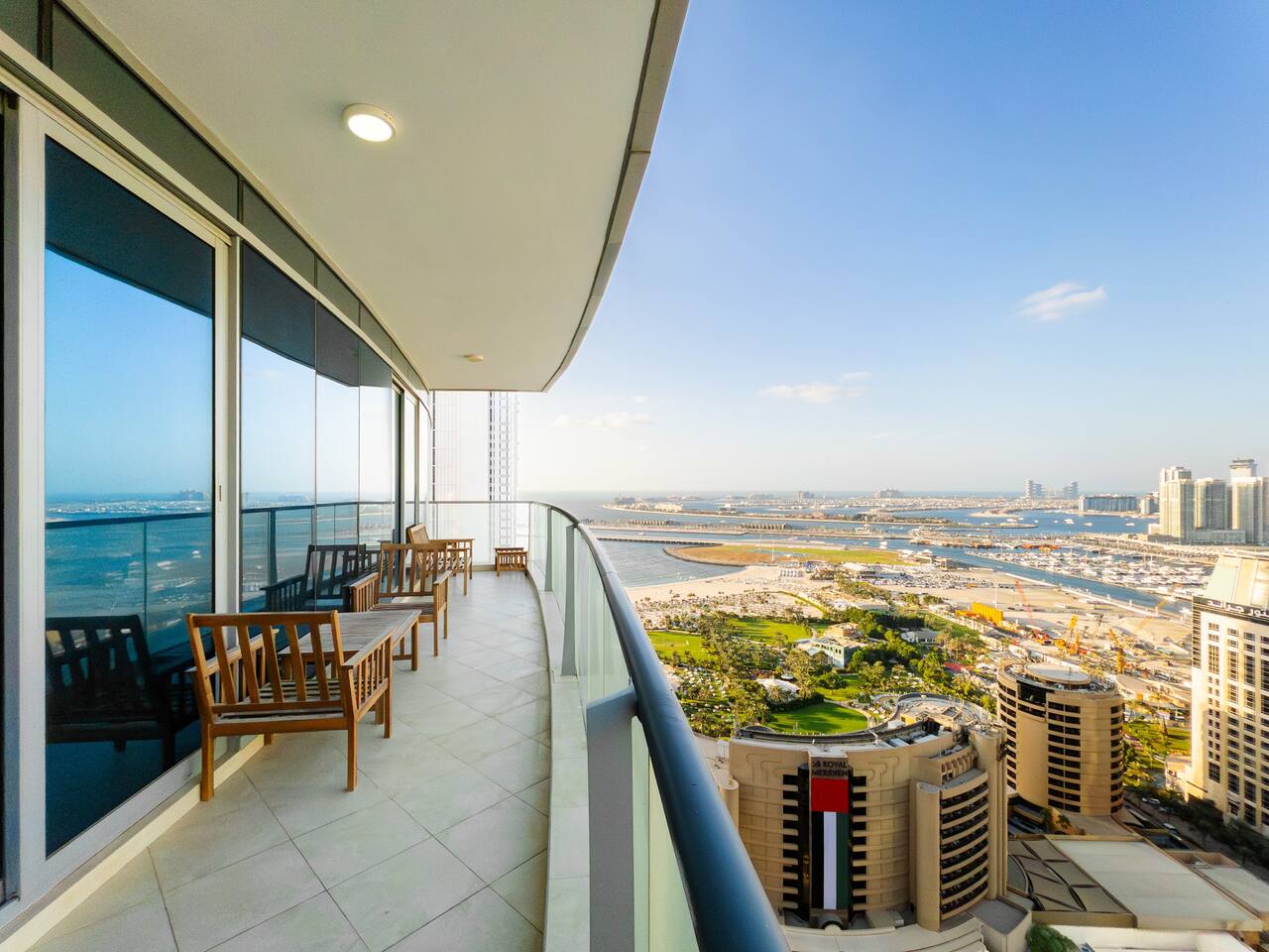 As soon as you step in and drop your bags, you know you picked the right place because... ...this 30th-floor 2BR in Trident Grand Residence gives you wide-open views of Dubai Marina and the Palm... Plus space to actually enjoy them from your private balcony. It’s fully stocked for families with free baby gear, a sky gym, Jacuzzi, sauna, and steam room for the grown-ups. And you're just minutes from JBR Beach, Marina Walk, Marina Mall, The Beach, and Ain Dubai.