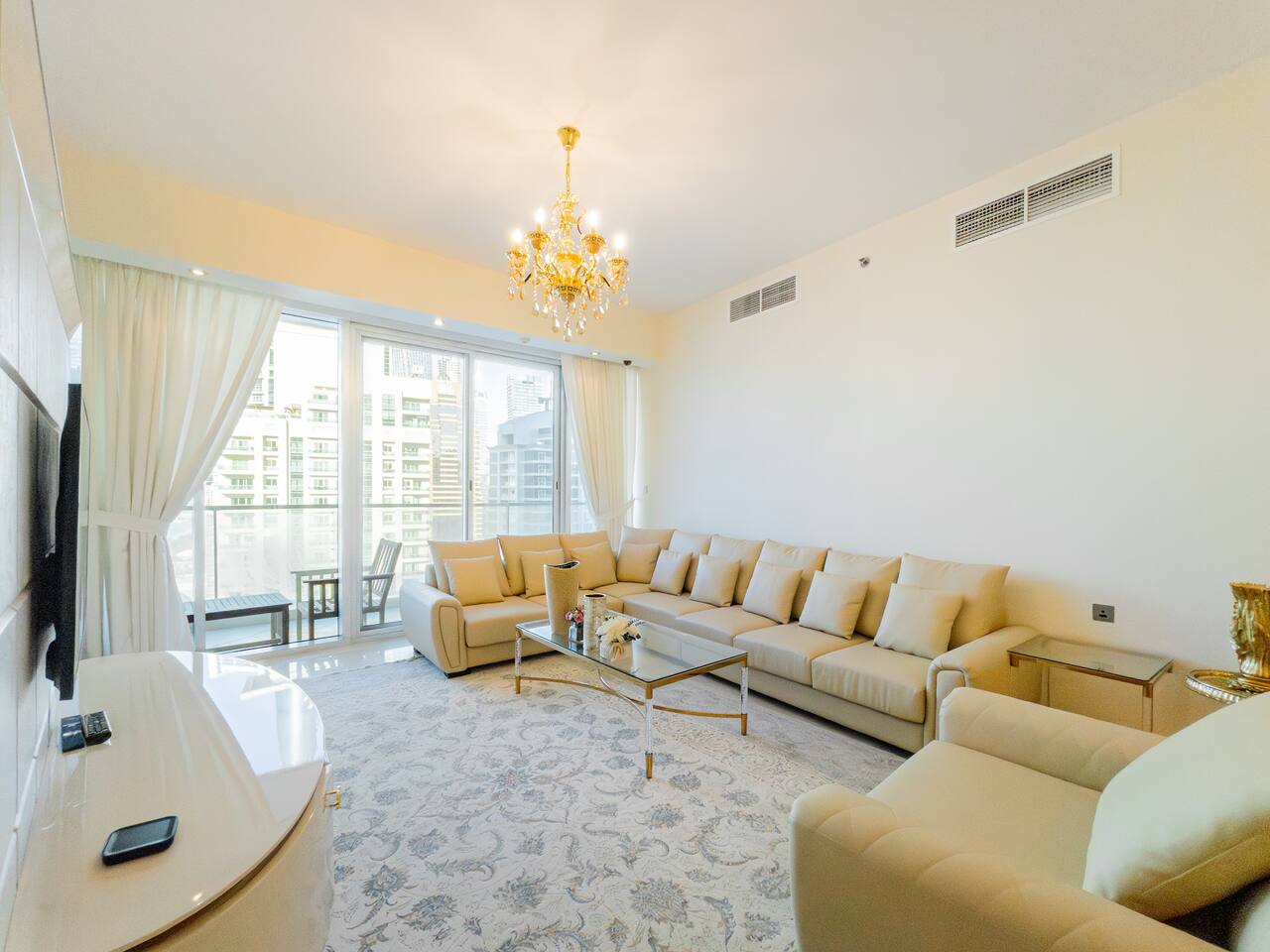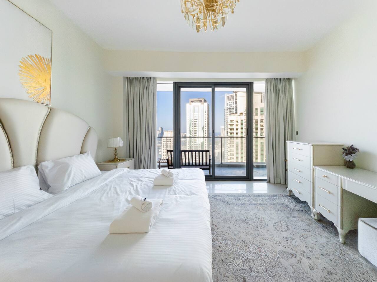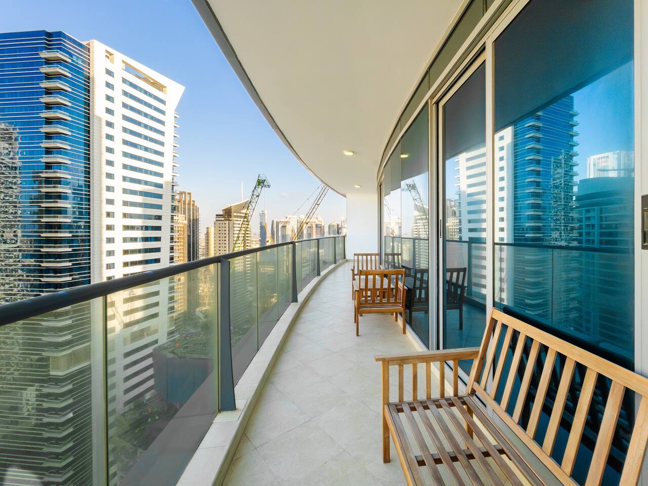 As soon as you step in and drop your bags, you know you picked the right place because... ...this 30th-floor 2BR in Trident Grand Residence gives you wide-open views of Dubai Marina and the Palm... Plus space to actually enjoy them from your private balcony. It’s fully stocked for families with free baby gear, a sky gym, Jacuzzi, sauna, and steam room for the grown-ups. And you're just minutes from JBR Beach, Marina Walk, Marina Mall, The Beach, and Ain Dubai.