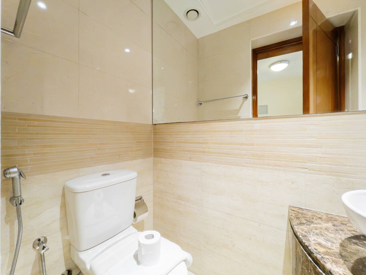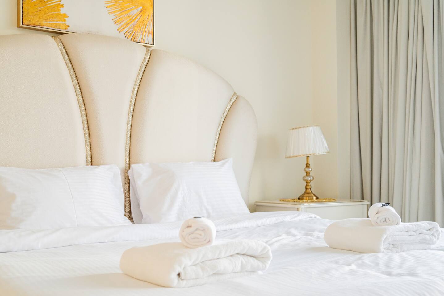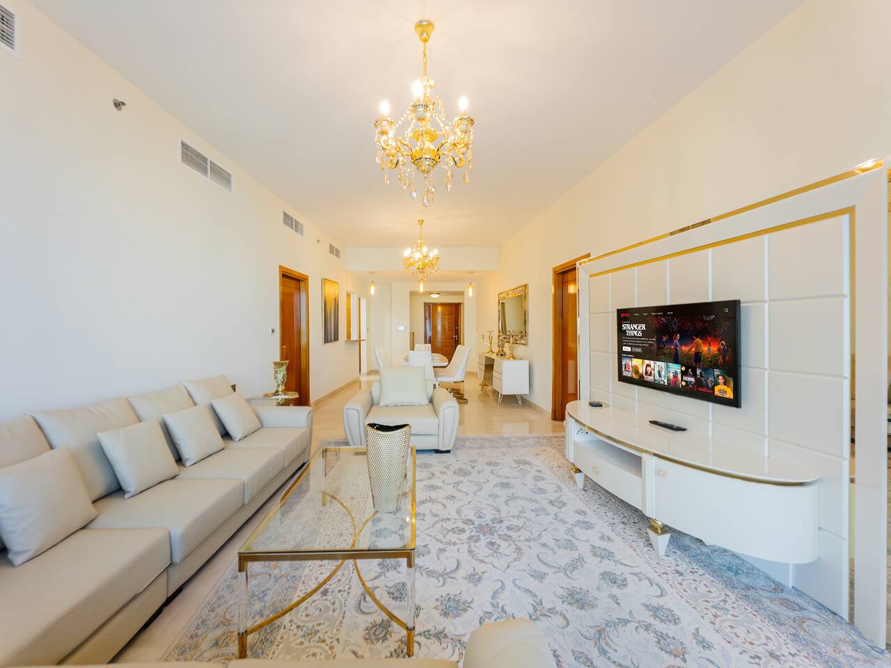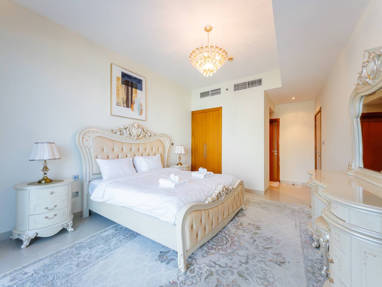 As soon as you step in and drop your bags, you know you picked the right place because... ...this 30th-floor 2BR in Trident Grand Residence gives you wide-open views of Dubai Marina and the Palm... Plus space to actually enjoy them from your private balcony. It’s fully stocked for families with free baby gear, a sky gym, Jacuzzi, sauna, and steam room for the grown-ups. And you're just minutes from JBR Beach, Marina Walk, Marina Mall, The Beach, and Ain Dubai.