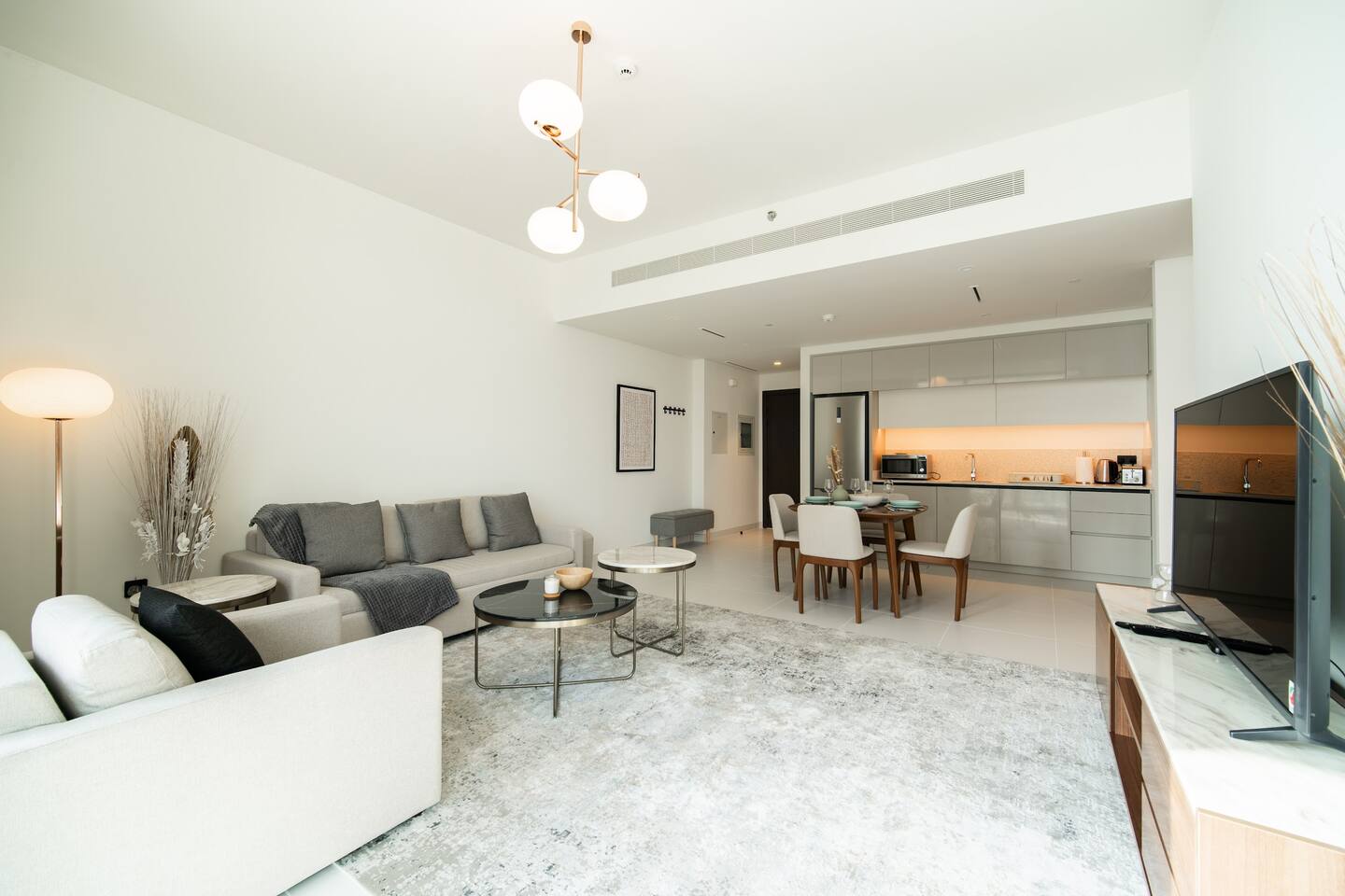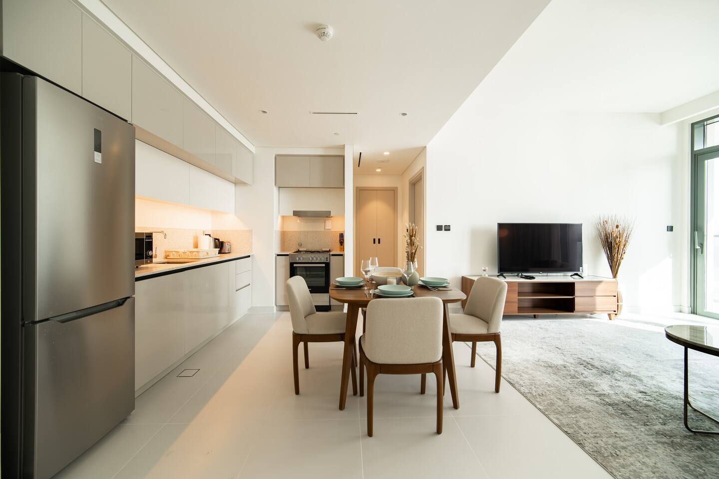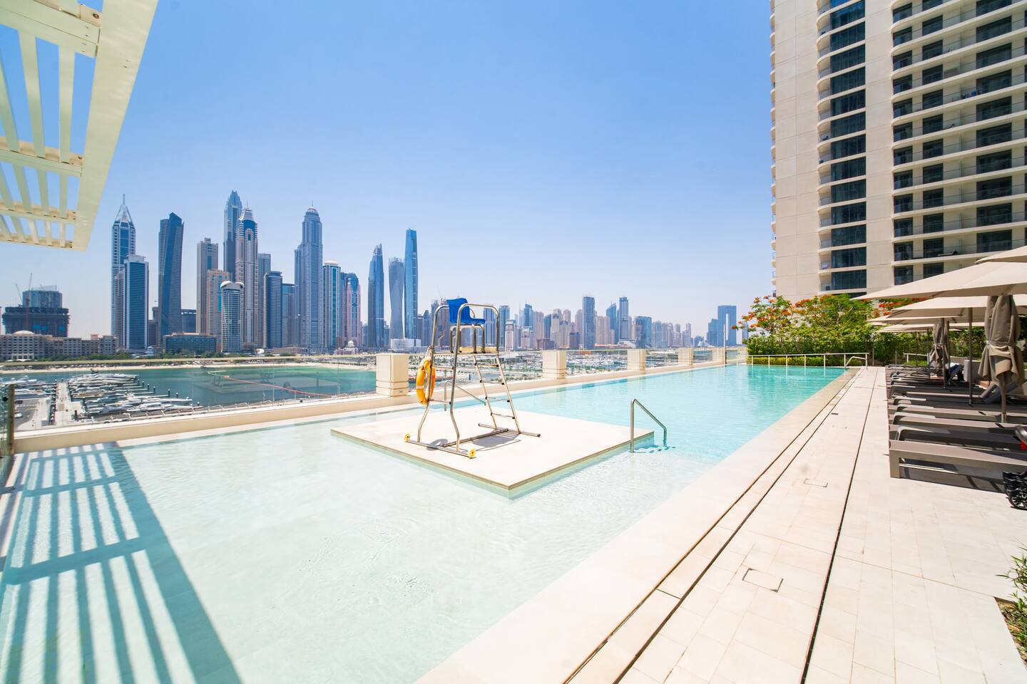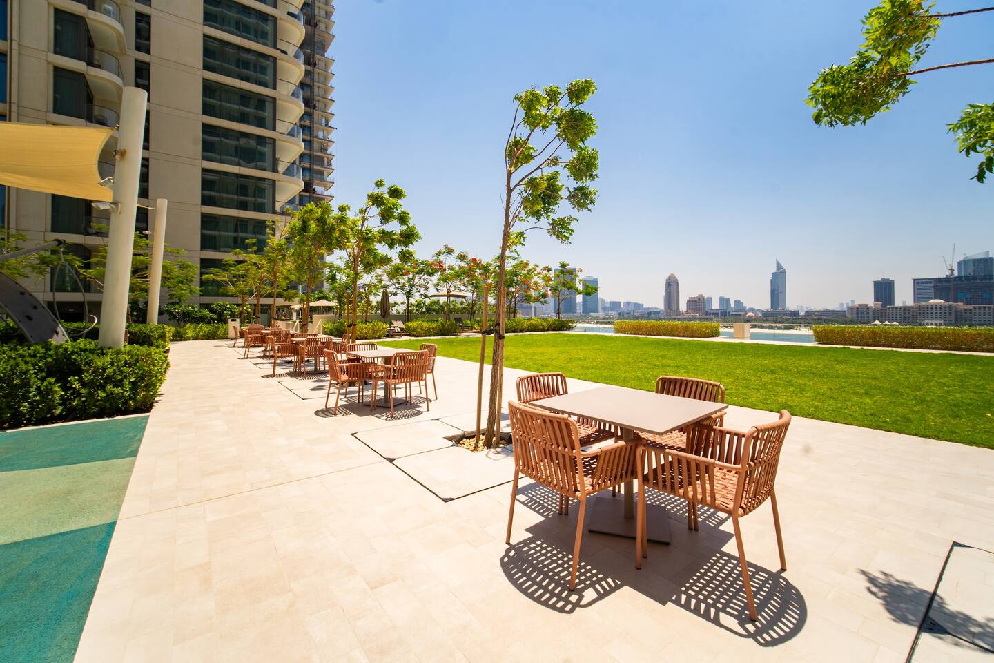 This apartment is in Marina Vista Tower at Emaar Beachfront. You’re just a few minutes from Dubai Marina, JBR, The Palm, shops, restaurants, and cafes. It’s a quiet spot with private beach access—right where the city meets the sea.
